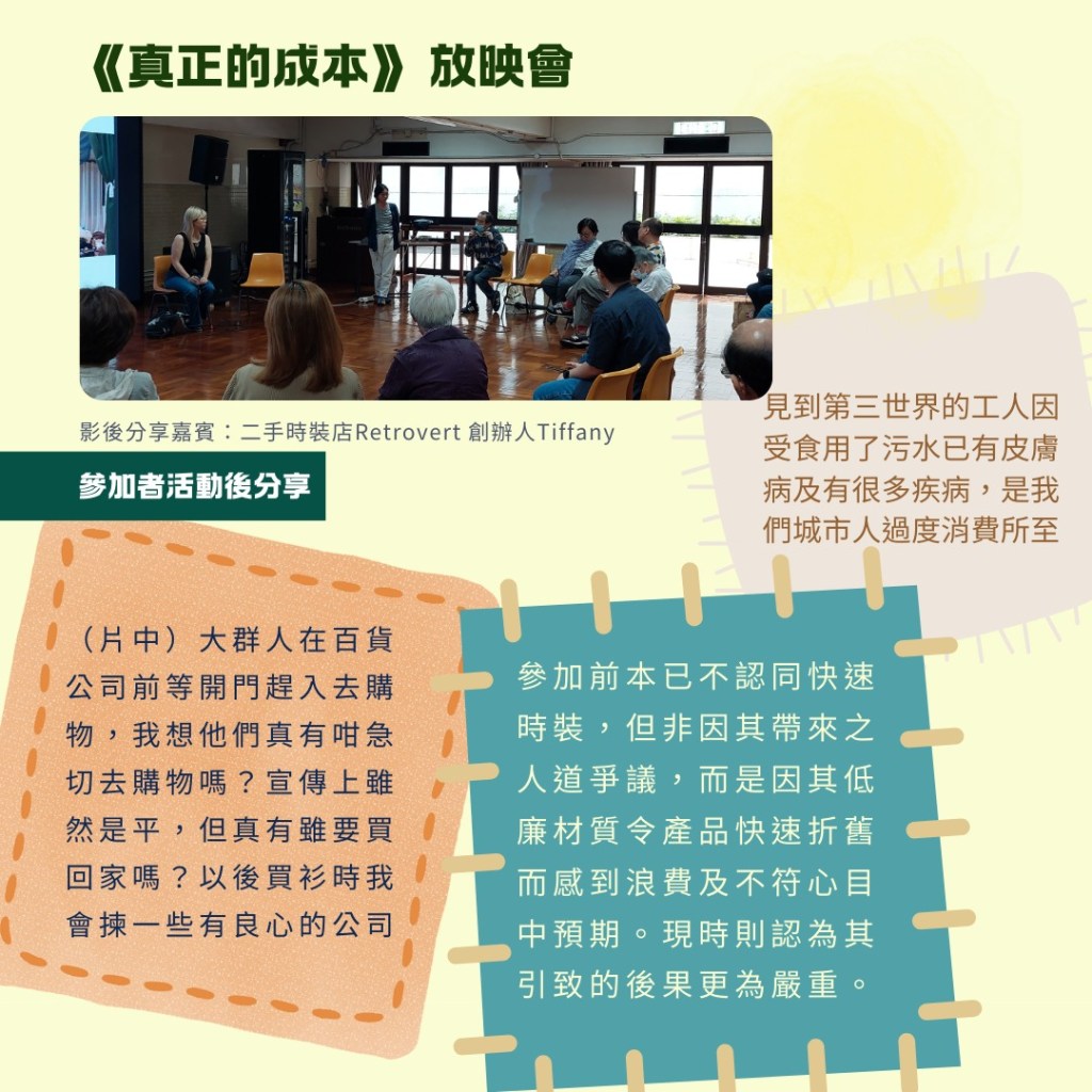 紀錄片《真正的成本》顧名思義是講述近年流行的快速時裝背後沒有計算的成本。由2013年孟加拉薩瓦區大樓倒塌事故切入,讓大家了解品牌、廠商如何剝削製衣工人壓縮成本以製作大量廉價時裝,造成惡性競爭。紀錄片又有講述基因改造的棉花和製衣工廠造成的污染對附近的居民有何影響⋯⋯讓參加者印象最深刻的是紀錄片最後一幕:美國的感恩節,大批人在未營業的商場門口等待,商場的閘門打開,人們湧到各貨架前搶購特價品。