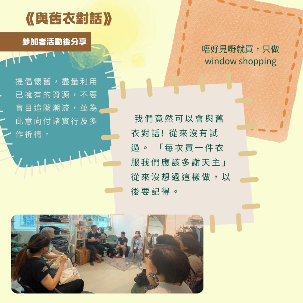 及後本會在二手衣服店 Retrovert舉行「與舊衣對話」靈修活動,參加者帶同自己的一件舊衣,透過默想對話反思自己的消費習慣。參加者帶來的衣服各色各樣,有人手製作的外套、堂區紀念日製作的T-shirt、被朋友聳恿購買的T-shirt、心愛的長裙⋯⋯大家的衣服都有自己的故事,參加者分享反思之餘都分享如何可以修復舊衣的心得,討論如何抗拒誘惑,明白世上萬物都是天主的創造。