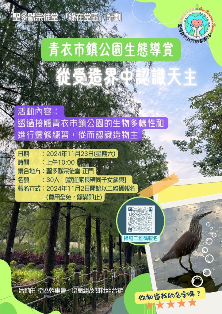 聖多默宗徒堂在2024年11月23日(星期六)早上舉辦青衣市鎮公園生態導賞。青衣公園生態地圖讓我們認識青衣市鎮公園的生物多樣性, 和透過進行靈修練習,從而在受造界中經驗的天主臨在。
