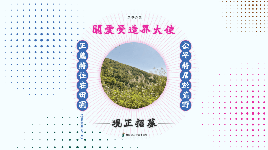 .鼓勵學員在個人生活和信仰實踐中融入自然關懷的元素,實踐愛主愛人愛大地的精神;